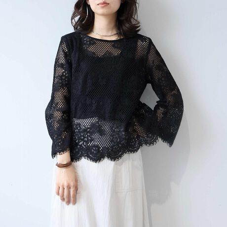 大人の肌を美しく見せる、上品な総レースのスカラップブラウス。