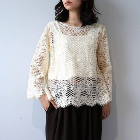 全面に贅沢にあしらわれたレースが目を引く、華やかさと気品を兼ね備えたブラウスです。