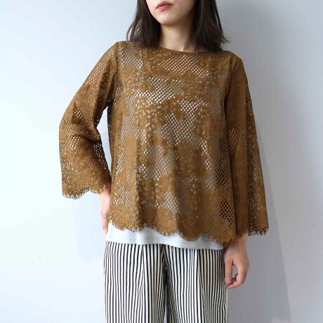 全面に贅沢にあしらわれたレースが目を引く、華やかさと気品を兼ね備えたブラウスです。