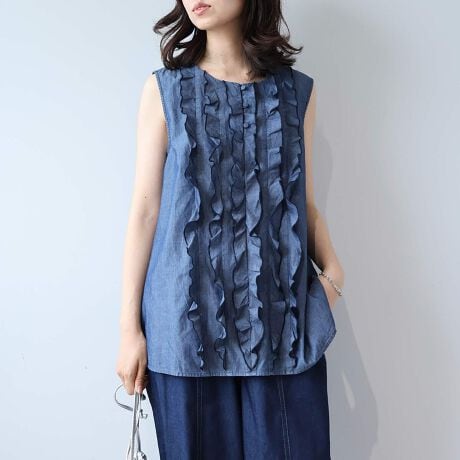 フロントフリルが華やかに映えるデニム素材のノースリーブブラウス。