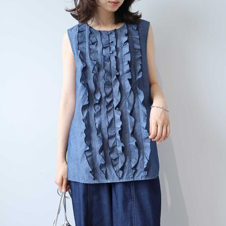 フロントフリルが華やかに映えるデニム素材のノースリーブブラウス。