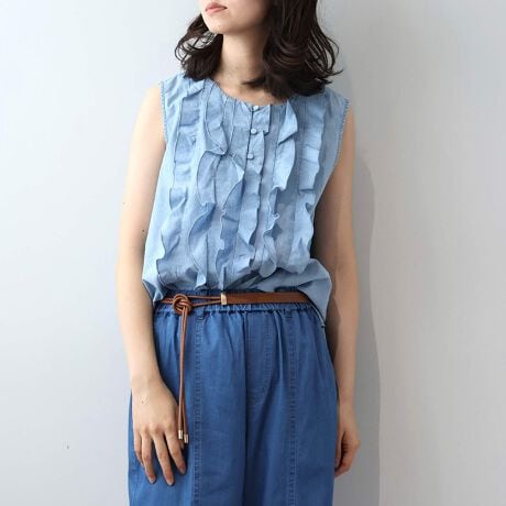 フロントフリルが華やかに映えるデニム素材のノースリーブブラウス。