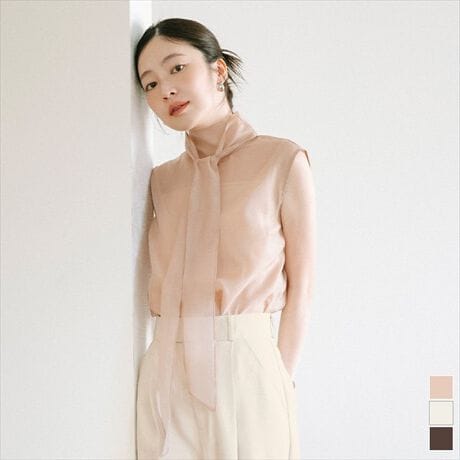 ハイネックの襟がモードなノースリーブトップス。ボウタイのデザインが女性らしさと上品さを演出高さのあるネックラインが、甘さを控えてくれます。繊細なシアー素材を使用した、軽やかな印象インナー付なのも嬉しいポイントです。一枚での着用はもちろん、ジャケットや羽織りのインナーとしてもおすすめです。大人のきれいめスタイルに取り入れたいアイテムです。[型番:BHXN2336]