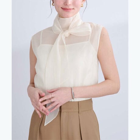 ハイネックの襟がモードなノースリーブトップス。ボウタイのデザインが女性らしさと上品さを演出高さのあるネックラインが、甘さを控えてくれます。繊細なシアー素材を使用した、軽やかな印象インナー付なのも嬉しいポイントです。一枚での着用はもちろん、ジャケットや羽織りのインナーとしてもおすすめです。大人のきれいめスタイルに取り入れたいアイテムです。[型番:BHXN2336]