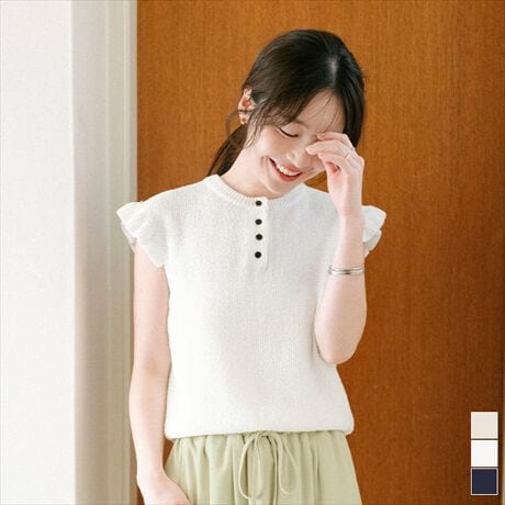 肩のフリルが大人可愛いを叶えるサマーニットフロントにあしらったボタンデザインがさりげないアクセントになり、きちんと感のある雰囲気に仕上げています。表情のある素材感が1枚で華やかさをプラス大人っぽく着こなせるコンパクトなトップスで、ボトムを選ばず合わせやすい一枚です。[型番:BHXU1999]