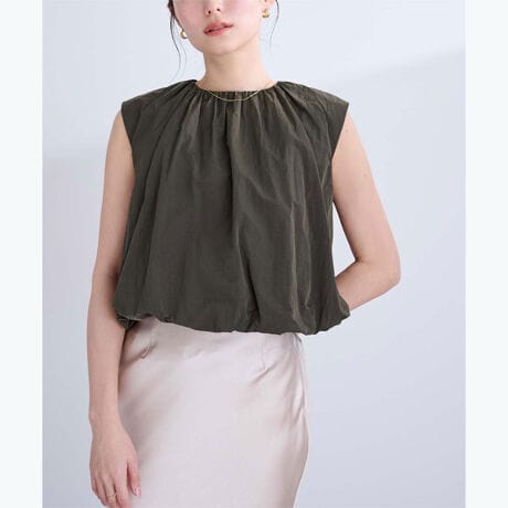 立体的なギャザーデザインが印象的な、ノースリーブブラウス。程よくボリュームを持たせたシルエットで、シンプルながら存在感のある一枚です。身体から離れるフォルムが、ラインを拾いにくく、肩まわりや身頃をさりげなくカバーしてくれるのもポイント。表面感は光沢がある素材で上品感をプラス。甘さを抑えたデザインで、大人可愛いを叶えます。[型番:BHXU2000]
