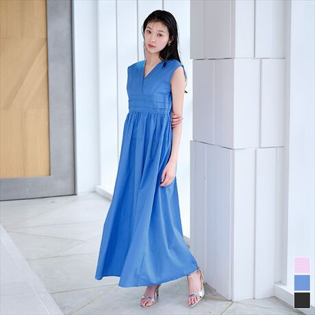 ノースリーブ仕様で、夏のリゾートシーンにも映える軽やかな一枚。