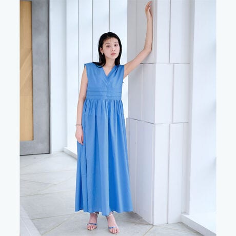 ノースリーブ仕様で、夏のリゾートシーンにも映える軽やかな一枚。