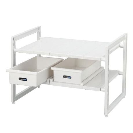 ●シンク下を使いやすくし、スッキリと収納できる、ストッカー2個付きの伸縮2段ラックです。