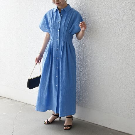 ウエストをタックでシェイプした、メリハリのあるシルエットが女性らしい雰囲気を演出。