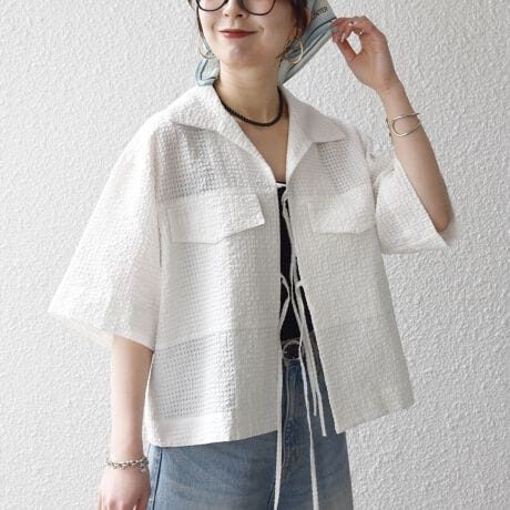 フロントのリボンディテールがポイントの半袖シャツジャケット。