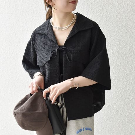 フロントのリボンディテールがポイントの半袖シャツジャケット。