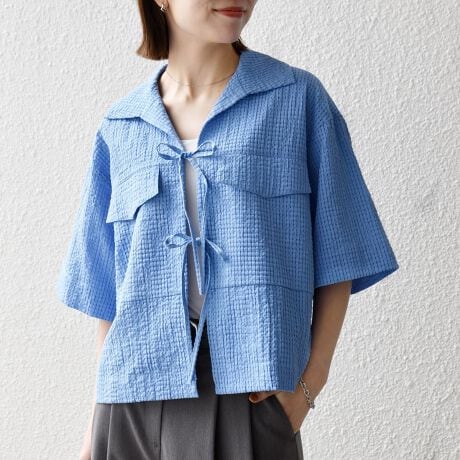 フロントのリボンディテールがポイントの半袖シャツジャケット。
