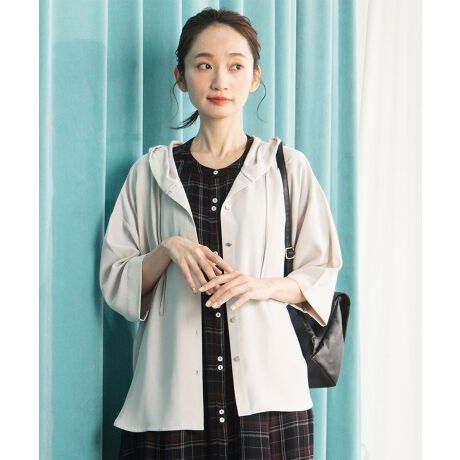 さらさらとしたスムースジョーゼット素材を使用した、上品な印象で着られるフーディブルゾン。