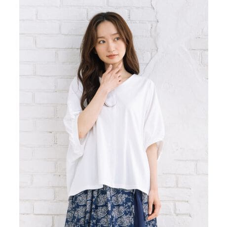 ドルマンスリーブとゆったりした身幅が体のラインを拾いにくく、リラックス感がありながらすっきり見えるのも魅力。