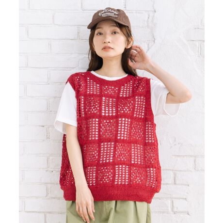 ブロックレース柄のざっくりとした編み地が目を引く、ナチュラルな雰囲気のニットベスト。