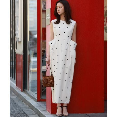 甘くなりがちなドットプリントを大人っぽいコクーンシルエットに落とし込んだワンピース。