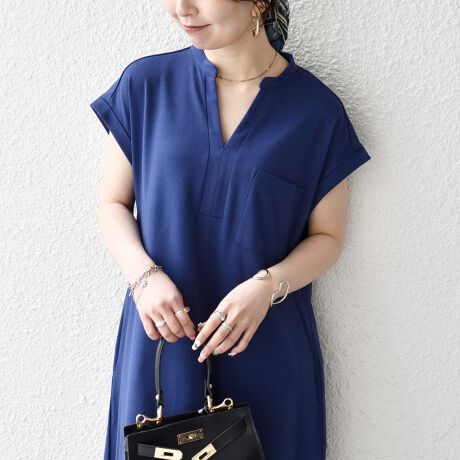 キーネックのすっきりとしたV開きと、シャツワンピのようなデザインがポイントのワンピース。