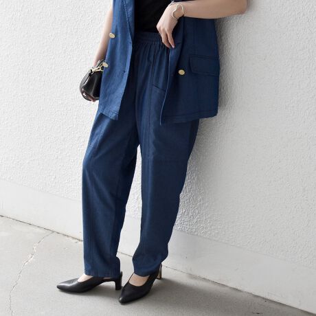デニム見えの素材ながら、落ち感のある生地できれいなシルエットに仕上げました。
