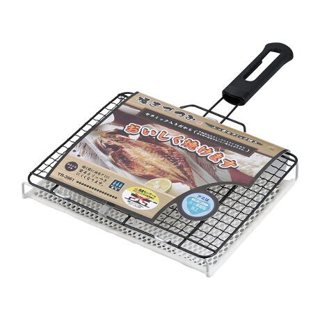 [型番:357242]【デザイン】●フッ素セラミックなのでむらなく焼きあがります。●使い易い取っ手付きです。●グリルなしで魚が焼けます。【スペック】サイズ/約幅24.9×奥行38.3×高さ4.6cm重量/約370g内容量/1個材質/焼きアミ:鉄(フッ素樹脂加工)下アミ:鉄(セラミック入石膏質)取っ手:フェノール樹脂生産国/中国製熱源/ガス火専用