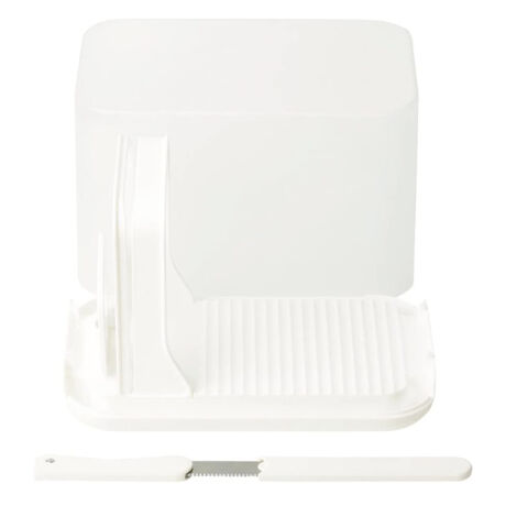 [型番:366430]【デザイン】●乾燥しないように保存できる●カットしやすい形状●大きくて見やすい調整メモリ●パンナイフはケース底にスッキリ収納●お手入れも簡単【スペック】サイズ/約幅30×奥行20×高さ20.5cm重量/約1.1kg内容量/1個材質/本体、フード:ポリスチレン(耐熱温度80度、耐冷温度-20度)刀身:ステンレス鋼刃の形状:片刃ハンドル・さや:ABS樹脂(耐熱温度80度)生産国/日本製食器洗い乾燥機/使用不可