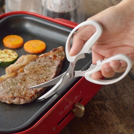 ●ホットプレートをキズつけずに食材を切り分けることができるキッチンバサミです。