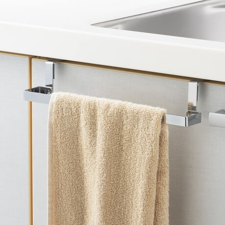 [型番:395551]【デザイン】●シンクや洗面所の扉に引っ掛けるだけで簡単に設置できるタオル掛けです。●裏側はバスケットになっているので、ごみ袋や洗剤のストックなどの収納に便利です。●接地面には傷をつけにくいクッション付きです。【スペック】サイズ/約幅26.3×奥行14.5×高さ40cm重量/約800g内容量/1個クッションゴム4個材質/本体:スチール(クロムメッキ)すべり止め:合成ゴム生産国/日本製