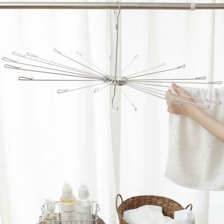 [型番:402713]【デザイン】●丈夫で錆びに強いステンレス製の、パラソルハンガーです。●風に当たると回転するので乾きが良いです。●洗濯物が一度に20枚干せます。●タオルが落ちないストッパー付きです。●使わない時は閉じてコンパクトに収納できます。●落下防止のストッパー付きです。【スペック】サイズ/約高さ39cm直径:約81cm収納時:約直径9.5×高さ49cm重量/約759g内容量/1個材質/ステンレス鋼生産国/中国製