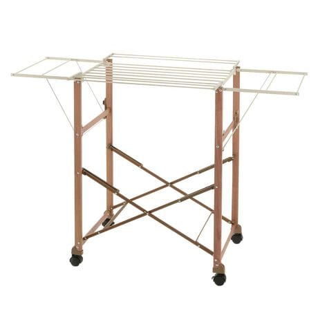 [型番:415887]【デザイン】●木目調で大容量の物干しスタンドです。●シャツやタオルを分けて掛けられます。●2段階調節できます。●移動がラクでコンパクトに収納できます。【スペック】サイズ/約幅141×奥行65.5×高さ114cm折りたたみ時:16.9×50.5×95.5cm内容量/1台材質/アルミ、スチール、ナイロンキャスター/付き耐荷重/ハンガーバー1本あたり:2kg(×4本)タオルバー1本あたり:600g(×10本)