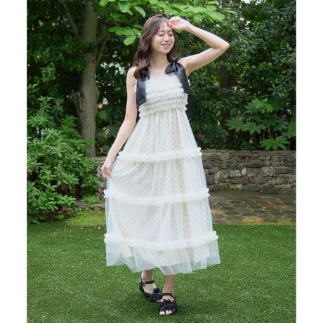 肩の大きなリボンと、胸元のフリルデザインが目を惹く主役級チュールワンピース。