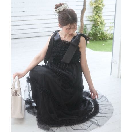 肩の大きなリボンと、胸元のフリルデザインが目を惹く主役級チュールワンピース。
