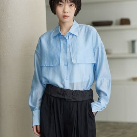 シアーな質感に胸元を覆うオーバーヨークを重ね、陰影を効かせたモードブラウス。