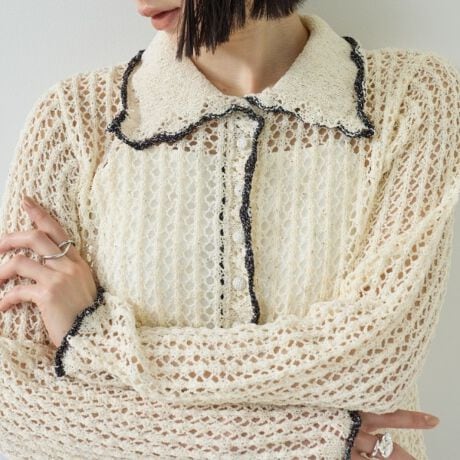 襟付きの透かし編みショートカーデ。