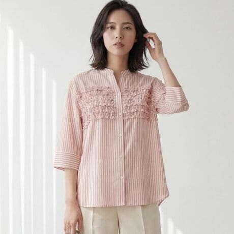 胸元にあしらったフリルディテールが華やかなデザインブラウス。