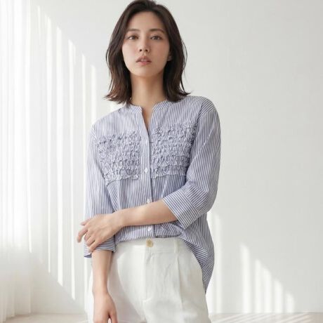 胸元にあしらったフリルディテールが華やかなデザインブラウス。