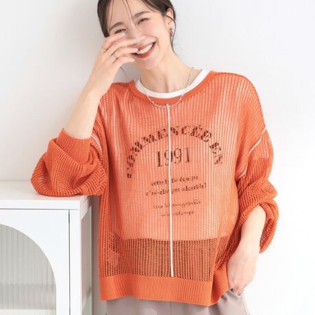 前後2WAYメッシュ編みのカーディガンにもなるニットトップスと、半袖のロゴTシャツのセット。