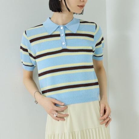 襟付きの顔まわりとメタルボタンが効いたポロニット。