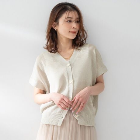 ザックリとした編地で軽く、ドライで清涼感のある編み地のボクシーでリラックス感あるスリーブレスカーディガン。