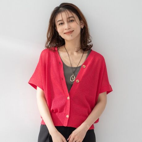 ザックリとした編地で軽く、ドライで清涼感のある編み地のボクシーでリラックス感あるスリーブレスカーディガン。