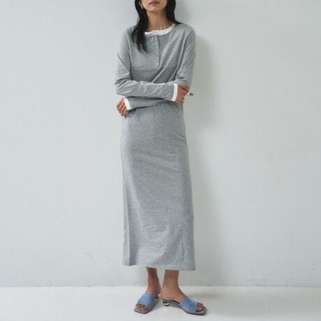 ヘンリーネックのスナップ開閉と深めのVラインで顔まわりをシャープに見せるロングワンピース。