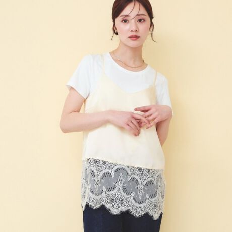 ・コンパクトなリブニットやTシャツの上から合わせたり、ゆるニットやカーディガンなどの裾からレース部分をレイヤードして見せることでこなれた印象に。