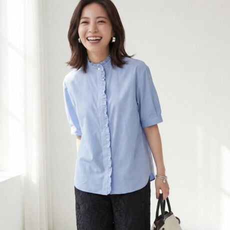 繊細なフリルをあしらったスタンドカラーが、顔まわりを上品に引き立てるブラウス。