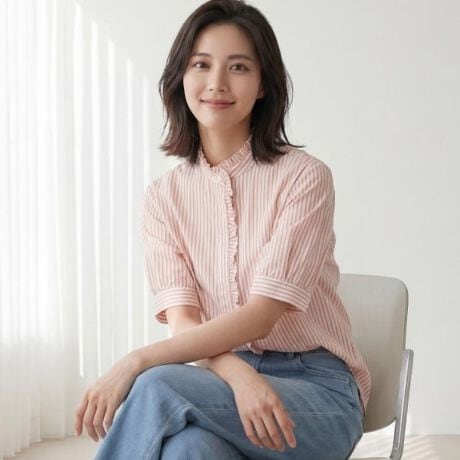 繊細なフリルをあしらったスタンドカラーが、顔まわりを上品に引き立てるブラウス。