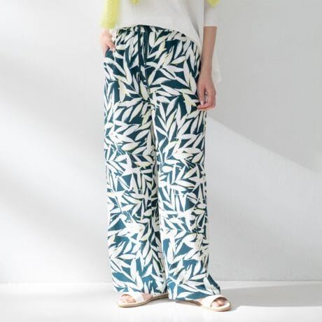 リラクシーさと洗練を兼ね備えたボタニカルリーフ柄のワイドパンツ。
