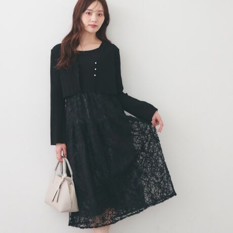 ・Vネックのショートカーディガンが付属し、衿元がシンプルで抜け感のある印象に。