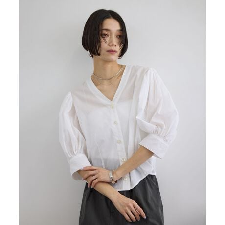 ボリュームのある袖に対し、すっきりとした身頃とシャープなVネックで甘さを抑えた大人バランスに仕上げています。