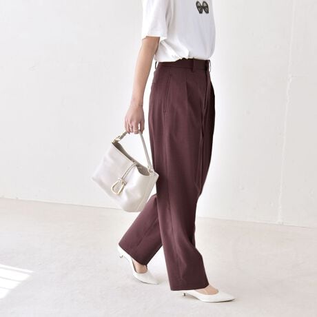 注目の素材、CALCULO(R)(カルキュロ)を使用したハイウエストのテーパードパンツ。