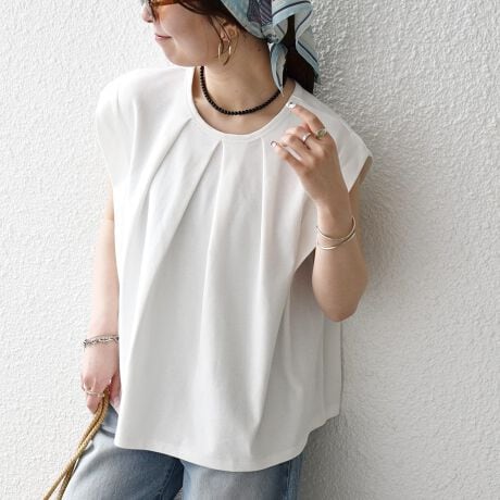 フロントに入ったタックがポイントの、一枚で着映えするノースリT。