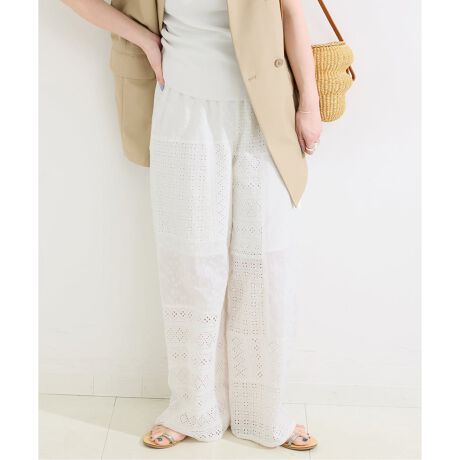 3種類のコットンレースをパッチワーク調に剥いだイージーストレートパンツ。