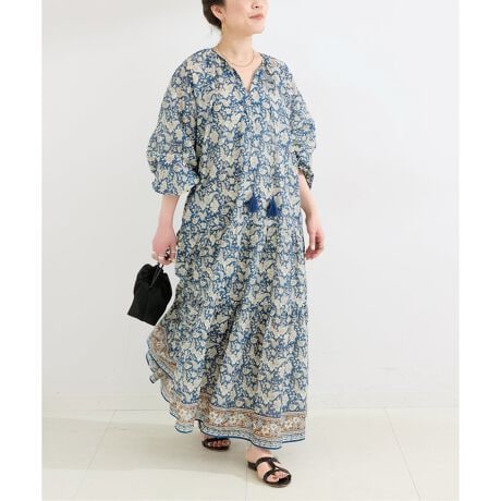 インドならではの奥行きある花柄プリントが目を惹く、印象的なワンピース。
